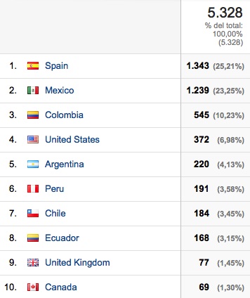 Up to that moment, the readers were mostly from Spanish-speaking countries. This is a sample of the reader´s location in a representative month (sept 2013):