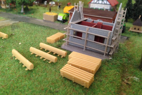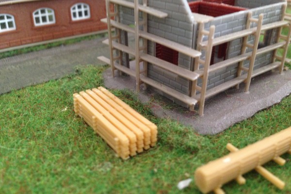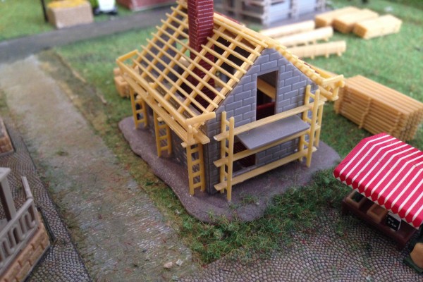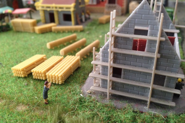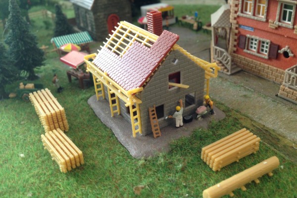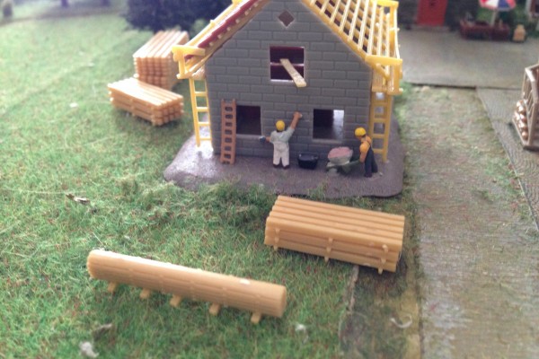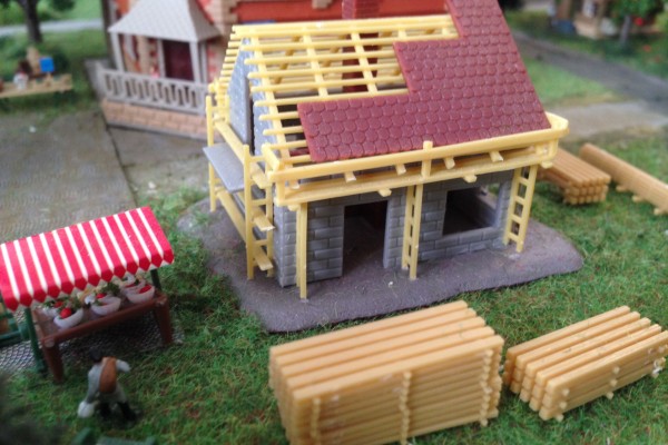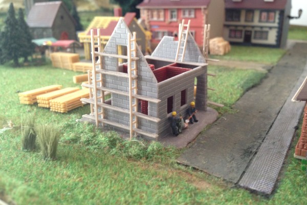 Actualmente estoy montando un pequeño pueblo por el que transcurre el tren. En una de las manzanas del pueblo, se está procediendo a la construcción de dos viviendas unifamiliares que vinieron en un kit de montaje.